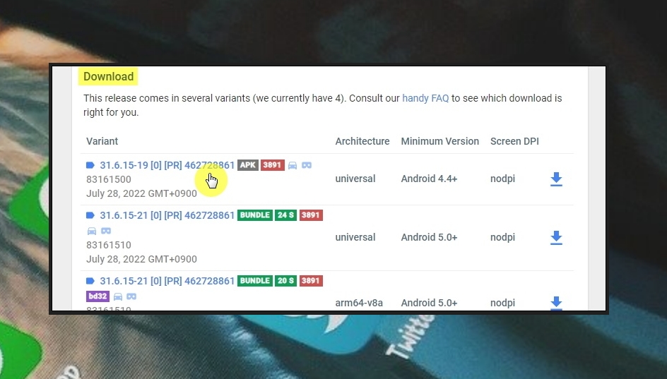 버전을 선택하면 다음과 같이 다운 받을 수 있는 APK 목록이 나타납니다. 여기서 보면 각 플레이 스토어에 대한 Architecture, Minimum Version, Screen DPI가 있는데요. 본인이 사용하는 기기와 안드로이드 운영체제에 맞는 것을 선택하면 됩니다. 스마트폰을 열고, 환경설정 페이지로 들어가 정보 버튼을 누르면 해당 내용 확인이 가능합니다.