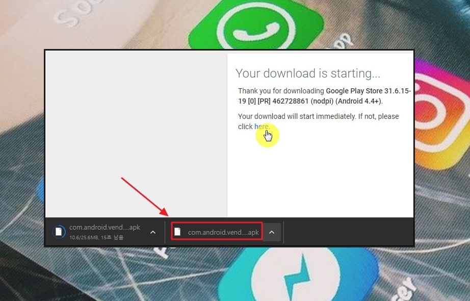 [Download APK] 버튼을 누르면 다음과 같은 새로운 창이 열립니다. 이 상태에서 조금 기다려보면 재설치 파일가 내 컴퓨터에 저장됩니다. 이때 컴퓨터와 스마트폰을 전용 케이블로 연결한 후 구글 플레이 스토어 APK 파일을 스마트폰으로 옮겨줍니다.