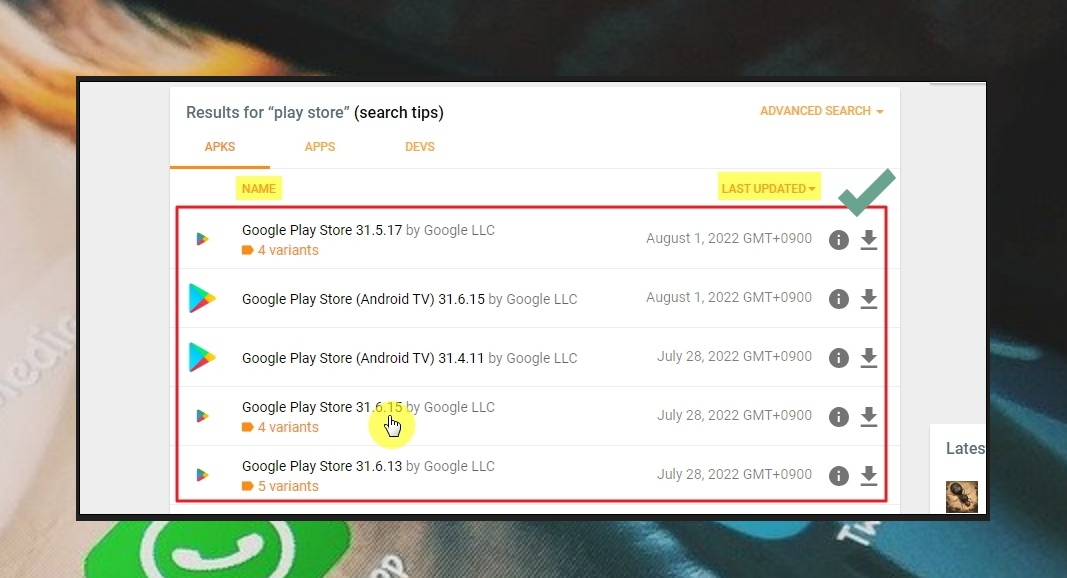 플레이스토어 검색 결과가 나왔습니다. 어플리케이션의 이름과 업데이트 된 날짜로 구성된 리스트가 나타는데요. 여기에서 재설치 하고 싶은 구글 플레이 스토어 버전을 선택해 주세요.