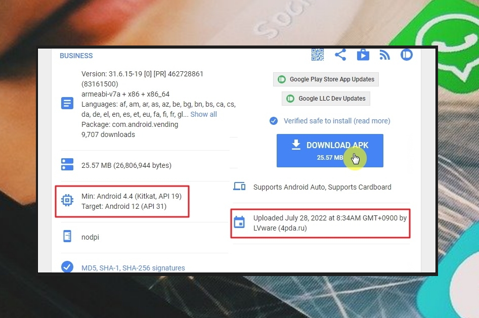 마지막으로 [DOWNLOAD APK] 버튼을 클릭해 주세요. 그럼 구글 플레이 스토어를 설치할 때 사용하는 APK를 내려 받을 수 있습니다. 재설치를 진행하기 이전에 MIn과 Target 부분을 확인해 주세요. 기기에서 사용하는 안드로이드 운영체제가 너무 낮으면 이번에 찾은 파일로 진행을 하지 못할 수 있습니다. 해당 사항을 미리 확인해 보세요.