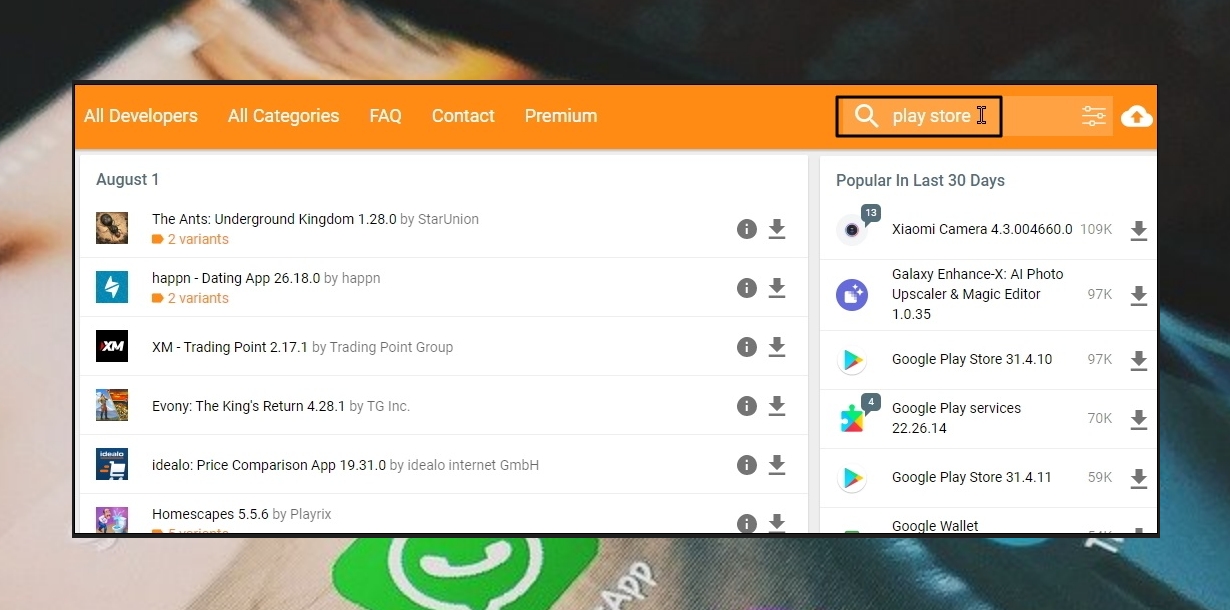 사이트에 접속했습니다. 최근에 업데이트 된 스마트폰 앱과 최근 30일 동안 인기를 끌던 앱이 보이네요. 해당 앱에 대한 APK 파일을 다운로드 받을 수 있는 버튼도 마련되어 있습니다. 그럼 여기서 구글 플레이 스토어 재설치를 도와줄 APK을 찾아보겠습니다. 간단하게 검색이 가능한데요. 사이트 화면에서 우측 상단에 있는 검색창에 "Play store"를 입력한 후 엔터키를 누르면 됩니다.