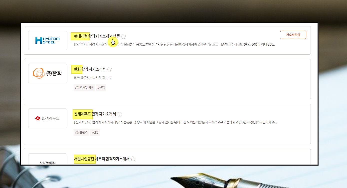 사람마다 성장과정은 다를 수 밖에 없습니다. 하지만 자기소개서를 작성할 때에는 합격자가 작성한 것을 참고하는 것이 좋은데요. 내용을 참고하라는 의미는 아니고, 글 쓰는 노하우를 참고하기 위해서 입니다. 그러기 위해서는 잘쓴예를 많이 확보하는 것이 좋은데요. 손쉽게 이러한 예시를 많이 보는 방법에 대해 알려드리도록 하겠습니다.