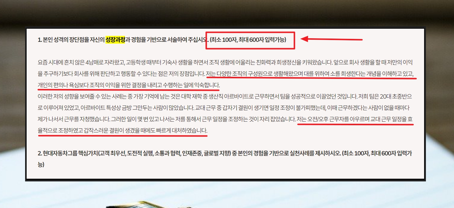 자기소개서의 항목을 작성할 때 보면 조건이 있는 경우가 있습니다. 이번 경우에는 최소 100자에서 최대 600자 입력이 가능하다고 되어 있는데요. 이런 식으로 본인이 취업하고자 하는 기업에 자기소개서 작성 조건과 유사한 예시를 찾아 보는 것이 좋습니다.