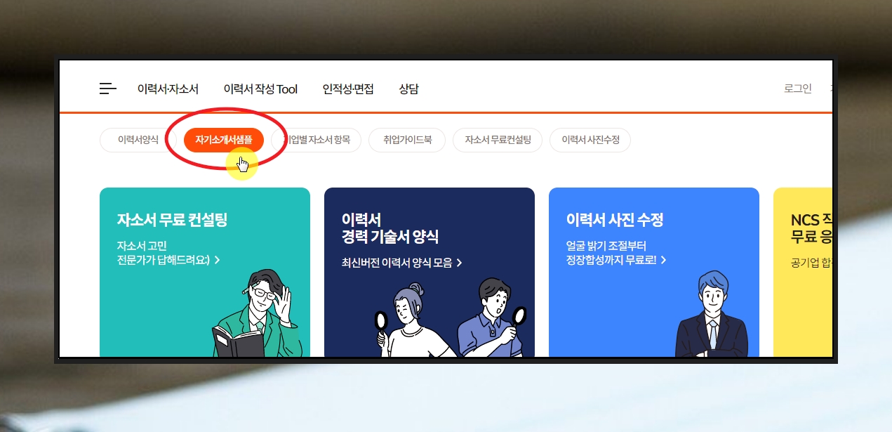 자료실 페이지가 열렸습니다. 여기에 보면 이력서 양식, 자기소개서 샘플, 취업 가이드북, 이력서 사진수정 등의 메뉴가 추가로 나타나는데요. 여기에서 자기소개서 샘플을 선택해 주세요.