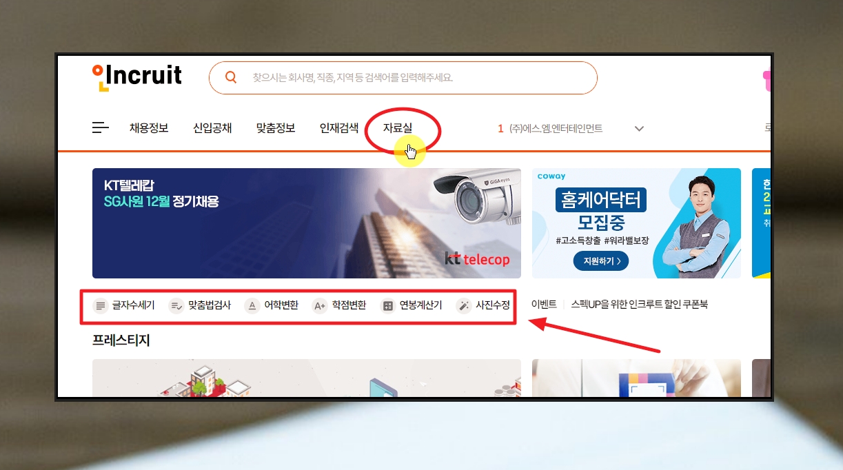 인크루트 공식 홈페이지에 접속했습니다. 메뉴에서 다섯 번째 위치한 자료실을 클릭해 주세요. 위에 화면에서 중앙에 보면 글자 수 세기, 맞춤법 검사, 어학변환, 연봉 계산기, 사진 수정, 학점 변환 등 취업을 준비하면서 유용하게 사용할 수 있는 도구가 있으니 참고해 주세요.