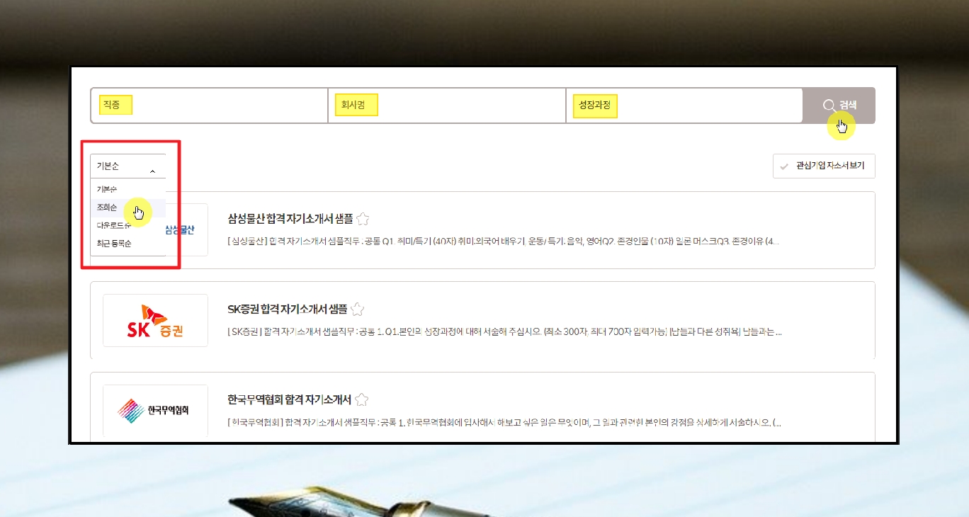 이제 본격적으로 자기소개서 성장과정 잘쓴예를 찾아보겠습니다. 일단 검색 기능을 사용하는 것이 편리한데요. 직종, 회사명을 입력한 후, 세 번째 항목에는 성장과정을 입력을 하고, 검색 버튼을 눌러주세요. 검색 결과에서 정렬이 가능한데요. 조회순 또는 다운로드 순으로 정렬 하는 것이 좋습니다. 사람들이 많이 찾는 잘쓴예가 배울 점이 많기 때문입니다. 사람마다 성장과정이 제각각이기 때문에 자기소개서에 쓸 성장과정 내용을 배끼는 것이 목적이 아닙니다. 합격자의 성장과정 잘쓴예를 참고하여 배울점을 파악하는 것이 주된 목적이라고 할 수 있죠.
