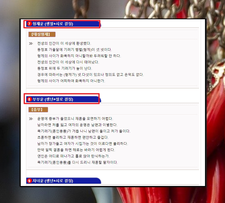 개별적으로 형제와 부모와 자녀간의 관계에서 있어서 어떤 운을 맞이하게 되는지 알아 볼 수 있습니다. 특이한 점은 부부운에서 보면 어떤 사람의 경우에는 "초혼이면 불리하고, 재혼하면 편안하고 즐겁다"고 합니다. 요즘 같이 이혼이 빈번한 시대에 어울리네 운세 해석이 보이네요..