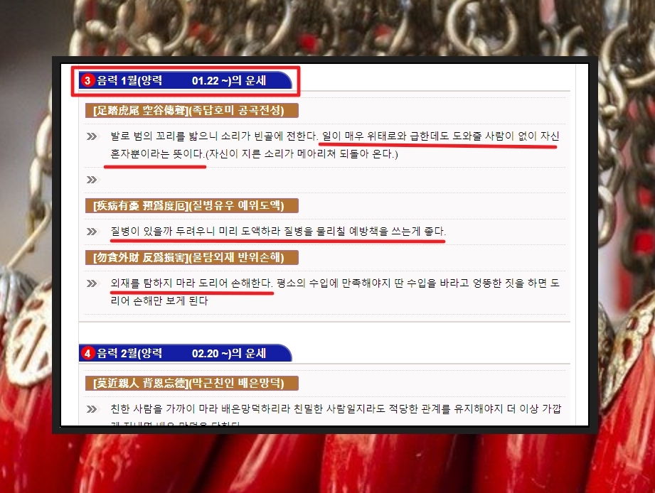 이곳에서 신년에 들어오는 풀이 외에 2024년 1월부터 12월까지 월마다 나에게 들어오는 운에 대해서도 알아 볼 수 있습니다. 음력 기준으로 구분되어 있는데요. 음력 1월은 양력 2024년 1월 22일부터입니다. 일을 진행함에 있어서 위태롭거나 급함, 질병에 대한 예방책이 필요함, 딴 수입을 바라고 엉뚱한 짓을 하는 것에 대한 금지 등 도움되는 이야기가 많습니다.