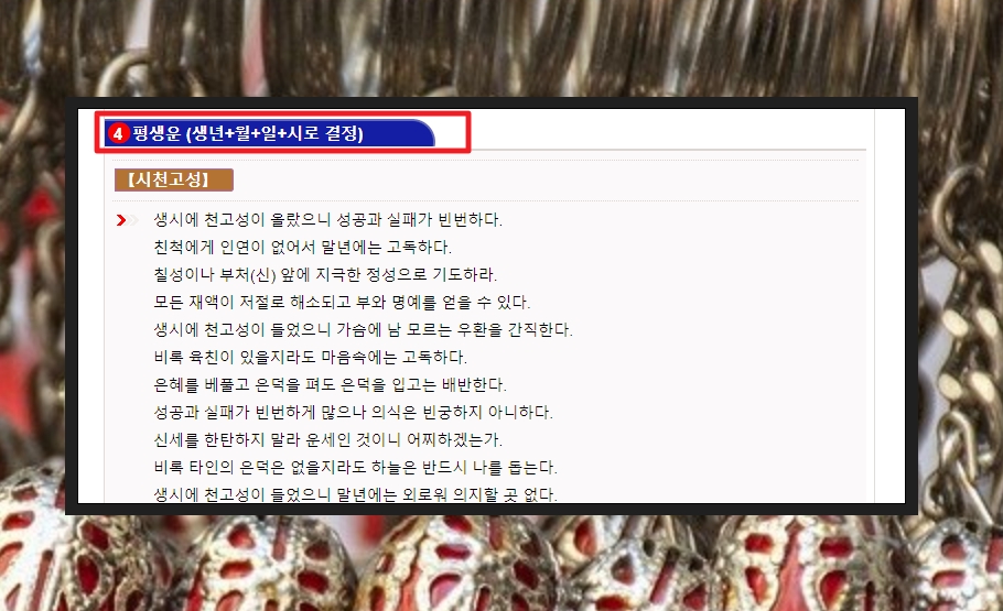 당사주의 평생운은 "생년월일시"로 결정이 되는데요. 나의 인생이 어떤 식으로 흘러가는지 살펴보는데 도움이 됩니다. 성공과 실패, 인연, 부와 명예, 우환, 부모와의 관계, 타인의 은덕 등 여러 가지를 이야기하고 있습니다.
