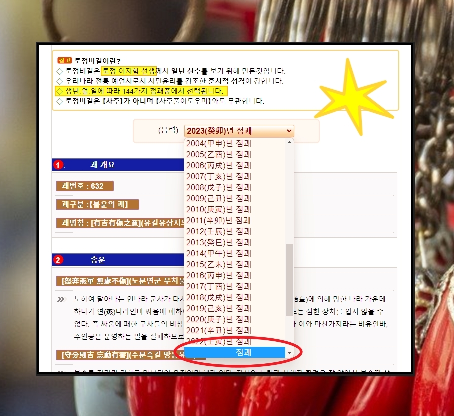 토정비결을 통해 2024년 신년운세 풀이 결과를 확인해 보겠습니다. 내용을 보면 아시겠지만, 해석이 꽤 방대한 편입니다. 여러 가지 면에서 나의 운세를 제대로 살펴볼 수 있죠. 일에 대한 성공과 실패, 조심해야 될 점, 질병이나 사건 사고 등 다양한 부분을 다루고 있습니다. 무료로 이러한 해석을 만나 볼 수 있죠.