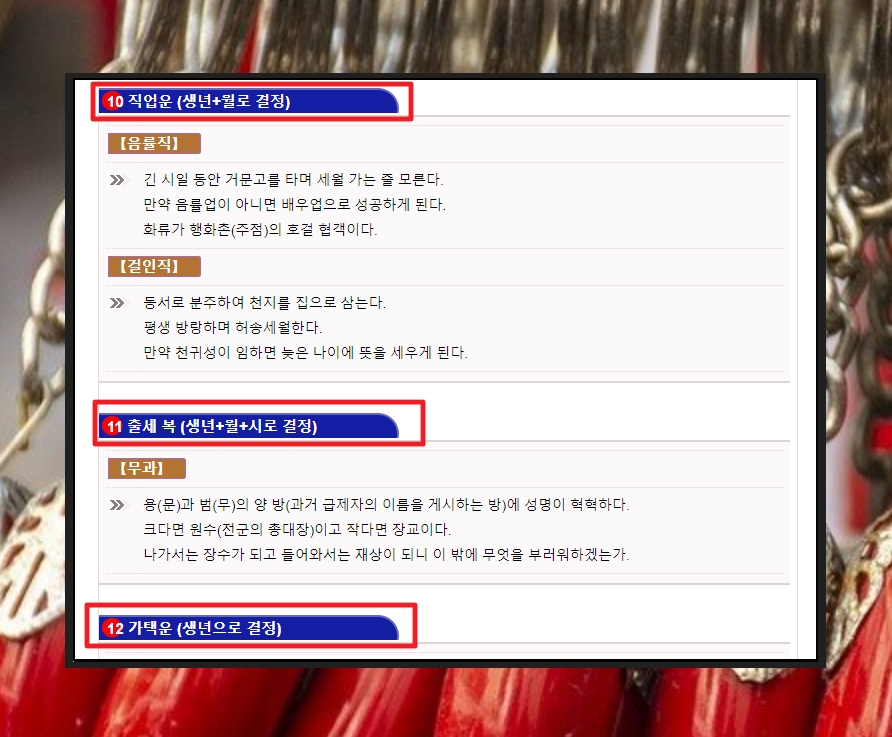 개별적으로 형제와 부모와 자녀간의 관계에서 있어서 어떤 운을 맞이하게 되는지 알아 볼 수 있습니다. 특이한 점은 부부운에서 보면 어떤 사람의 경우에는 "초혼이면 불리하고, 재혼하면 편안하고 즐겁다"고 합니다. 요즘 같이 이혼이 빈번한 시대에 어울리네 운세 해석이 보이네요..