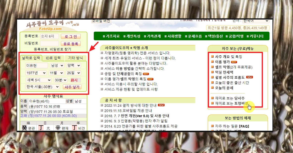 사주 풀이 도우미 사이트에 접속해 습니다. 사이트에 접속하면 좌측 상단에 있는 이름, 성별, 태어난 날짜와 시각 등의 정보를 입력한 후, [사주 넣기] 버튼을 눌러 주세요. 그 다음 우측에 보면 [자주 보는 무료 메뉴]가 있습니다 여기에서는 신년운세에 관련된 토정비결 이외에도 만세력, 오늘의 운세, 사주, 이름 평가, 작명 등 여러가지 무료 서비스를 선택할 수 있어요.