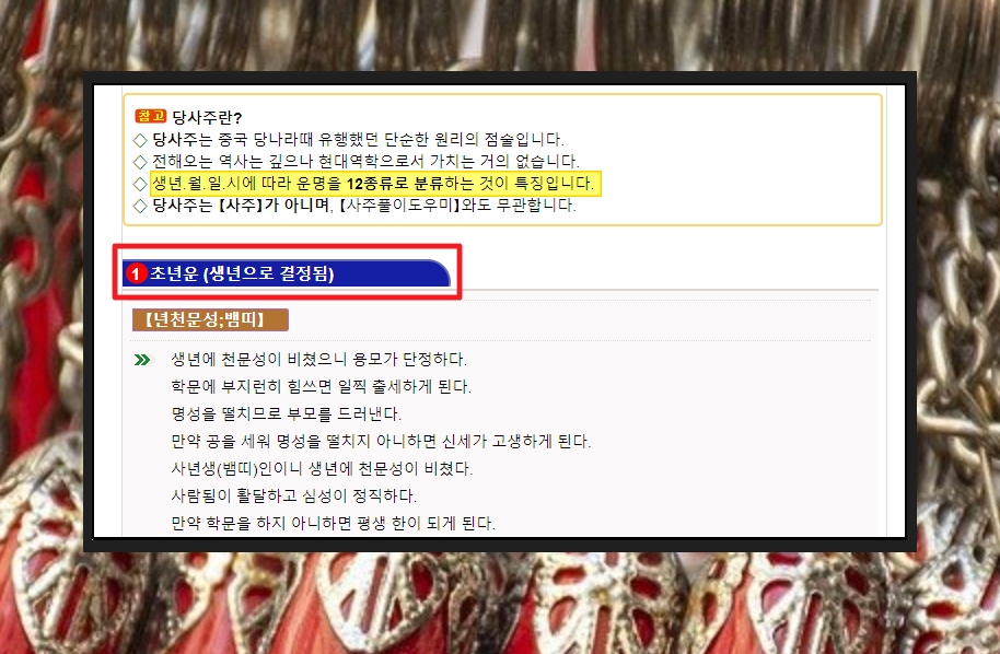당사주의 평생운은 "생년월일시"로 결정이 되는데요. 나의 인생이 어떤 식으로 흘러가는지 살펴보는데 도움이 됩니다. 성공과 실패, 인연, 부와 명예, 우환, 부모와의 관계, 타인의 은덕 등 여러 가지를 이야기하고 있습니다.