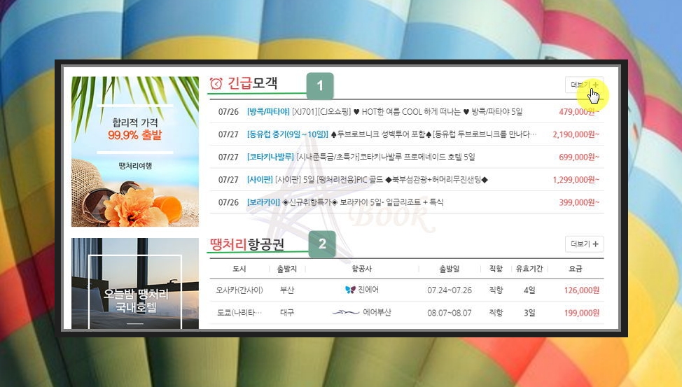 홈페이지에 접속하고, 조금 아래로 스크롤을 내려보면 해외여행 긴급모객 메뉴가 나타납니다. 그 아래에는 떙처리항공권도 같이 나타나는데요. 둘 다 비슷하지만, 한 번에 편리하게 이용할 수 있는 여행상품을 먼저 알아보도록 하겠습니다.