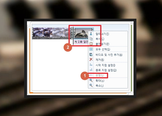 분할하고 싶은 위치에 마우스 우클릭 후 분할을 눌러보세요.