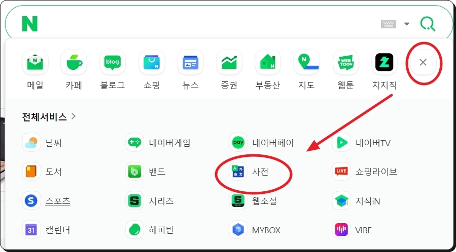 국내에서 무언가 알아볼 때 네이버 사이트를 많이 이용하는데요. 이 때 검색창 아래에 있는 "전체 메뉴 보기" 버튼을 클릭해 보세요. 그럼 [전체 서비스] 카테고리에서 7번째 위치에 속한 [사전] 메뉴를 찾을 수 있습니다.