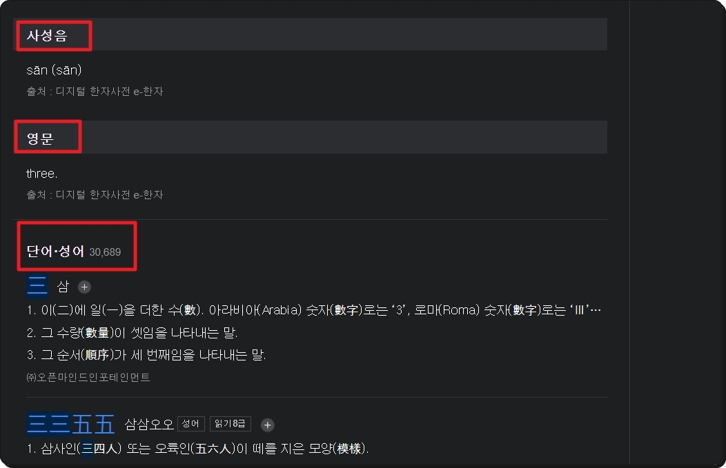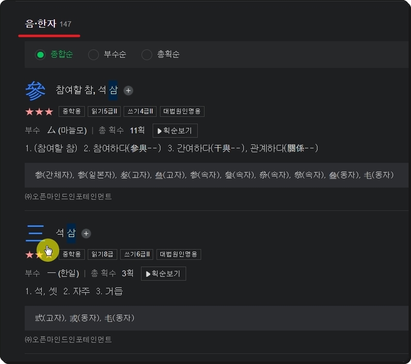 저는 "석 삼"이라는 한자를 찾아보았는데요. 인명용 여부, 난이도, 부수, 모양자, 뜻 등 다양한 정보를 얻을 수 있습니다. 추가적으로 획순이나 이체자 확인도 할 수 있어요.