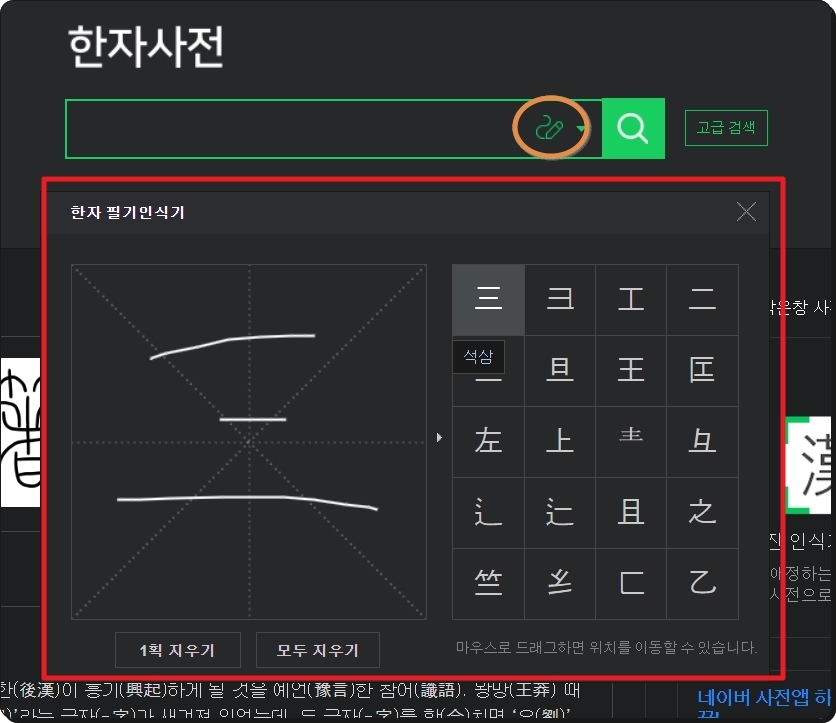 "필기인식기"는 모르는 한자 찾기에 정말 유용해요. 옥편 사용법을 몰라도 그냥 모르는 문자의 모양을 따라 그리기만 하면 되기 때문이에요. 그 다음 찾아보려고 했던 문자를 클릭하면 됩니다. 그럼 검색창 안에 우리가 그렸던 문자가 입력될 거에요.
