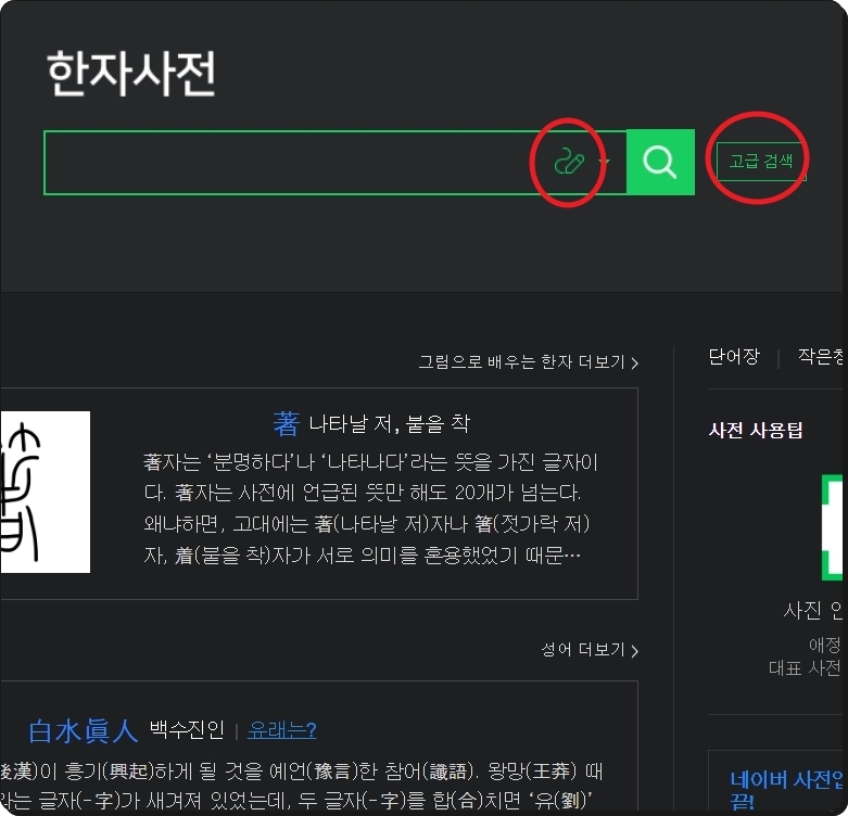 네이버 어학사전 사이트에는 한자는 물론이고, 다양한 외국어에 대한 사전 서비스르 제공하고 있는데요. [메뉴]에 있는 "한자"를 클릭해 보세요. 그럼 한문사전 페이지가 열립니다. 여기에서 모르는 한자를 검색하면 되는데요. 이 때 "돋보기 모양"의 아이콘 옆에 있는 버튼을 왼쪽부터 차례때로 클릭해 봅니다.