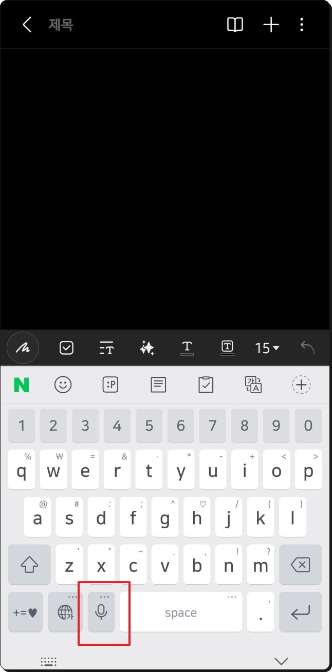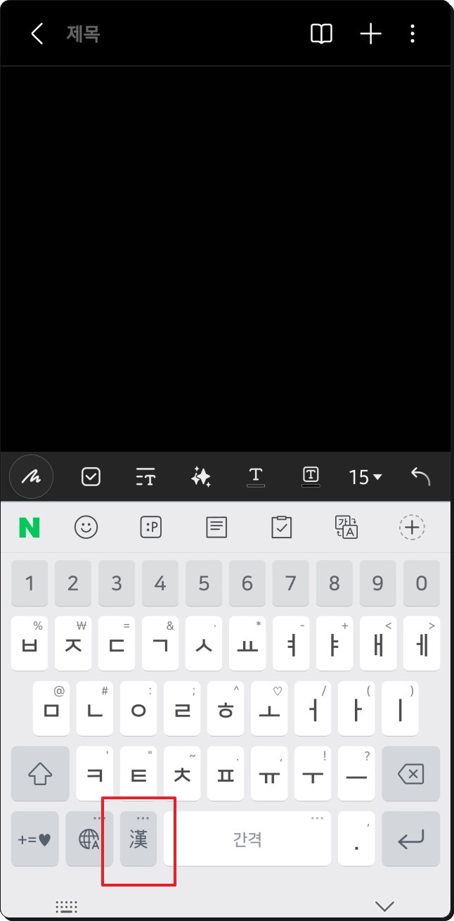 그럼 메모장 앱을 실행한 후 한글을 한자로 변환해보도록 할게요. 일단 키보드 화면에서 [음성] 버튼을 꾹 누르고 있어 보세요. 그러면 여러 가지 버튼을 선택할 수 있는 창이 나타납니다. 해당 창에서 [한문] 버튼을 선택합니다. 이렇게 하면 키보드에 [한문] 버튼이 생겨요.