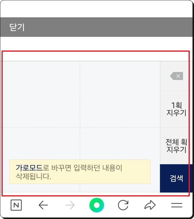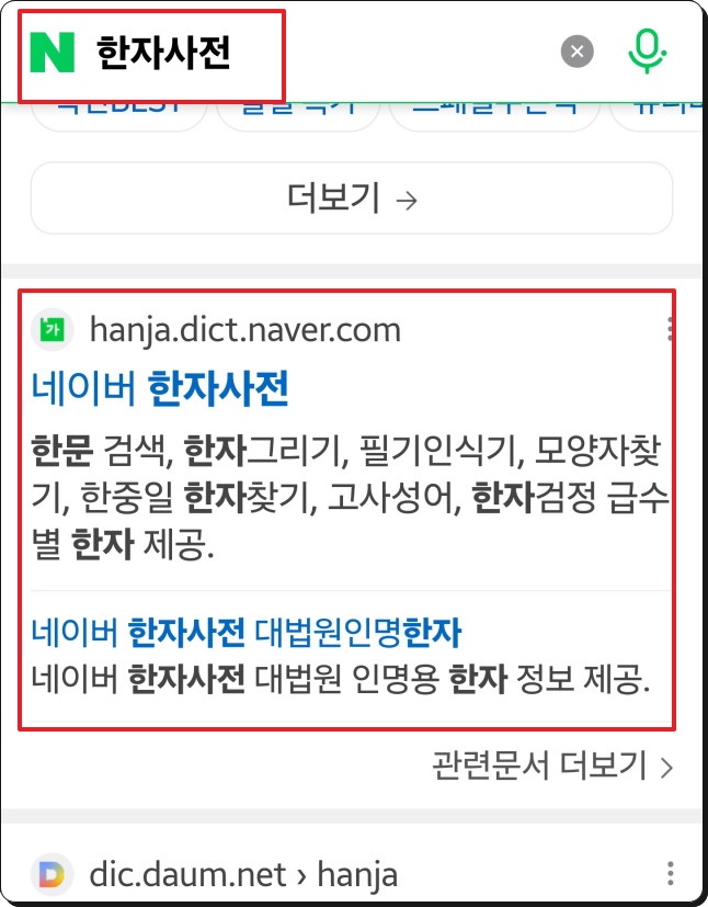 혹시 키보드 앱 설치 없이 휴대폰에서 한자 변환을 하고 싶은 분들을 위해 준비했습니다. 이 경우에는 인터넷 브라우저를 실행한 후 "한문 사전"을 검색해 주세요. 그 다음 네이버 한문사전 사이트에 접속합니다. 사이트에 접속하면 검색창 아래에 여러 개의 버튼이 있는데요. 가장 왼쪽에 있는 버튼을 눌러주세요.