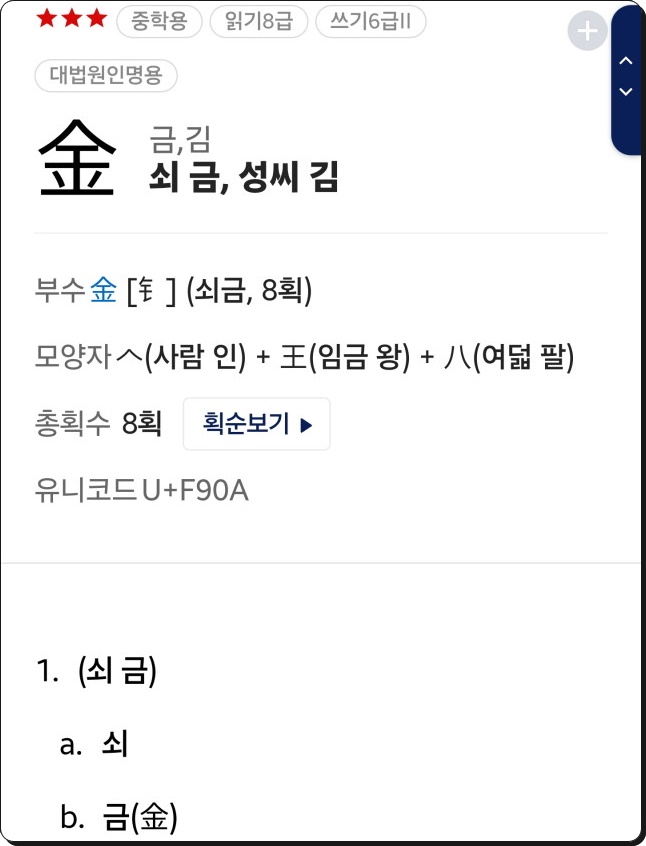 여기까지 진행하면 검색창에 한자가 입력이 되는데요. 이것을 복사해서 사용할 수 있습니다. 상세한 한문사전 정보를 보는 것도 가능해요.