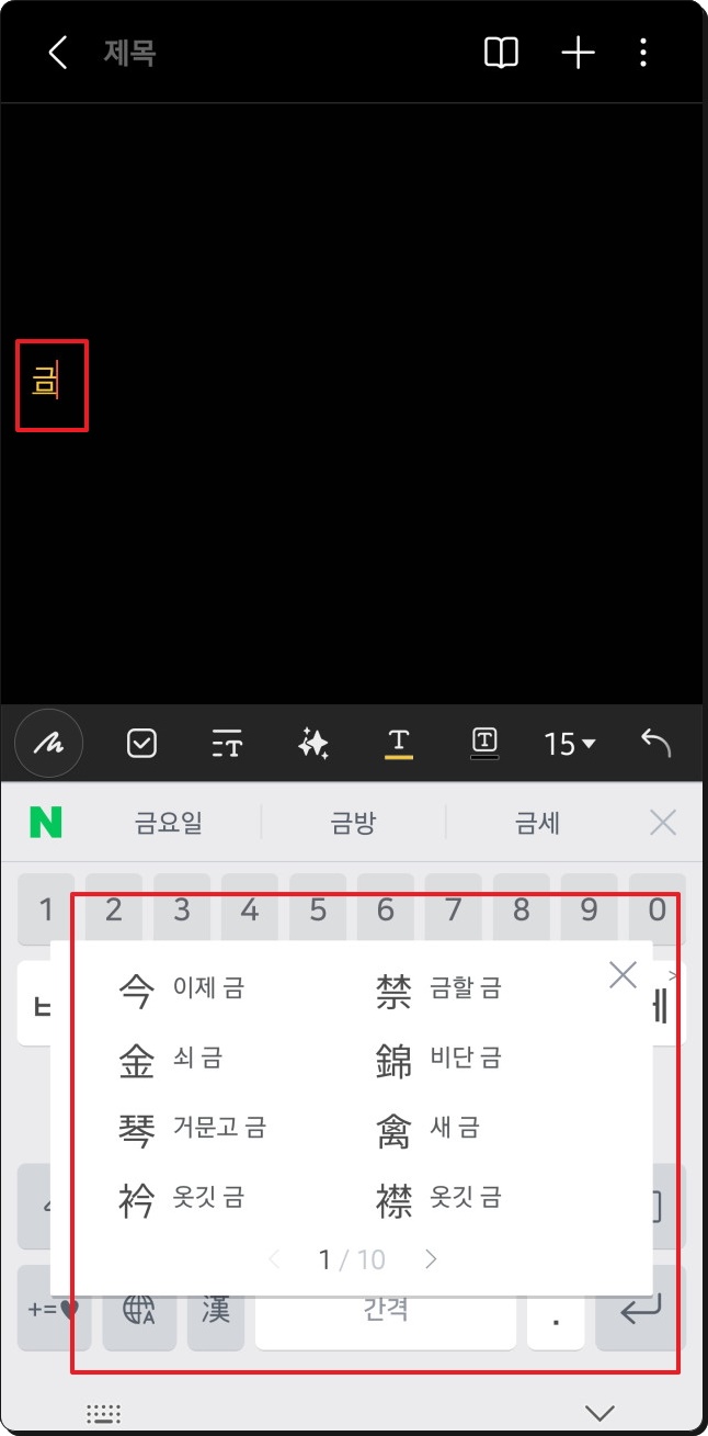 이제 메모장에 한자로 변환할 "한글 음"을 입력합니다. 저는 "금"을 입력했는데요. 한글을 입력하자 마자 키보드에 있는 [한문] 버튼을 눌러주세요. 그럼 변환할 수 있는 문자 목록이 나타납니다. 여기에서 선택하면 돼요.