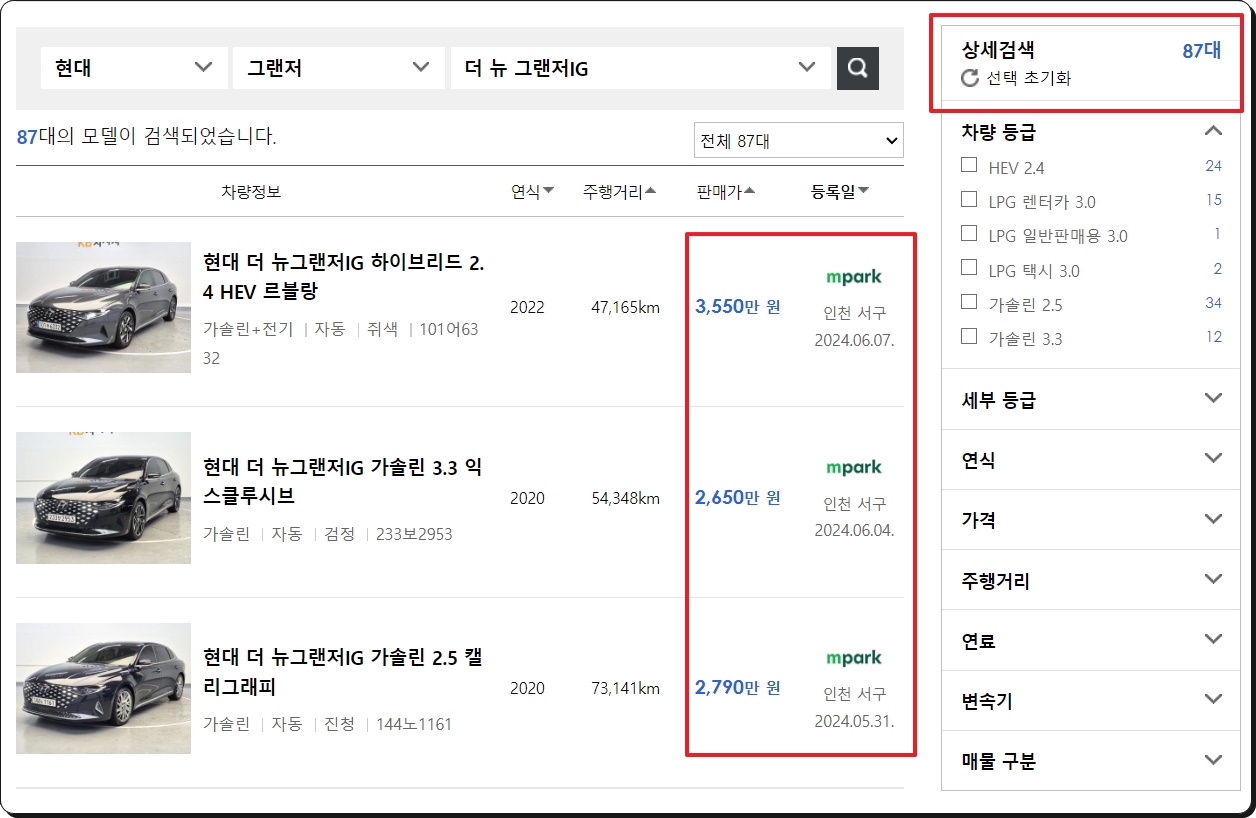 저는 "현대 더 뉴그랜저IG 가솔린 3.3 익스클루시브" 중고차 매물을 선택했는데요. 많은 사진과 차량 및 성능 정보를 확인할 수 있습니다. 가격도 있고, 판매자 연락처도 있으니 구매도 할 수 있어요.