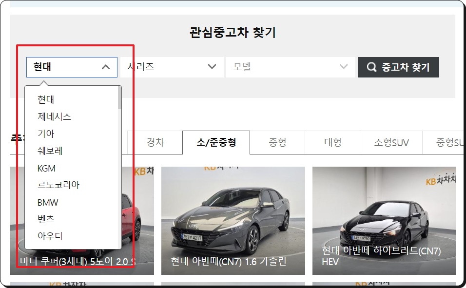 많은 매물로 구성된 중고차 시세표 보기.