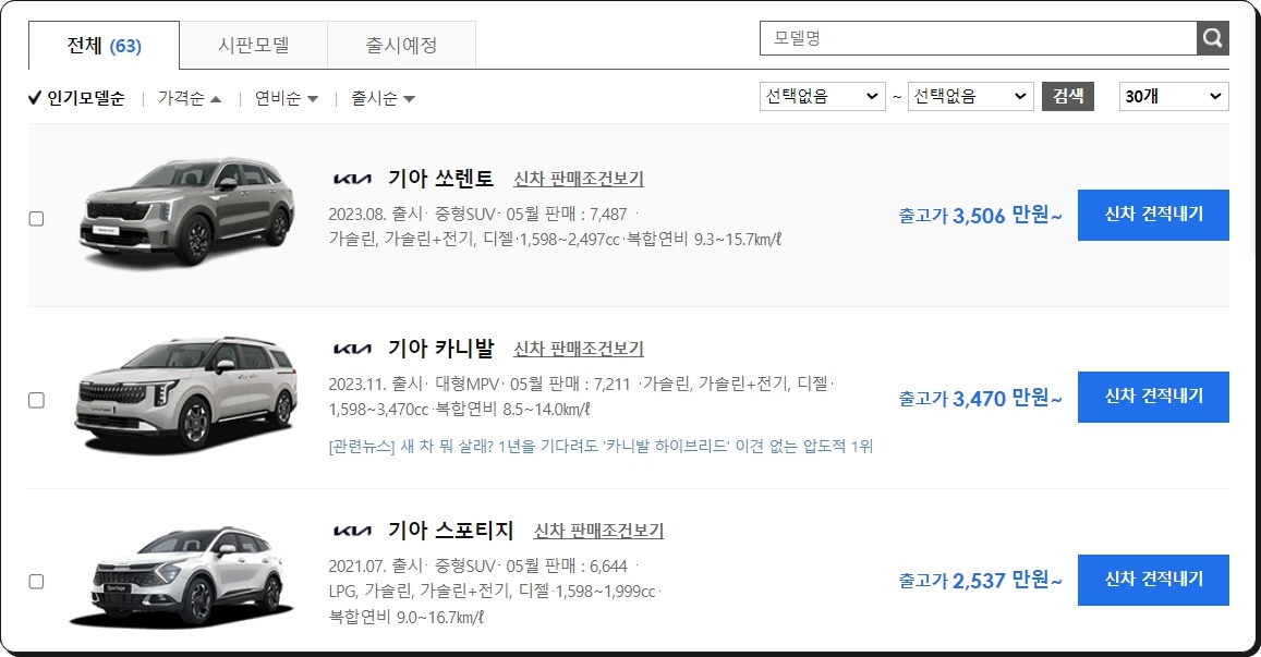 제가 지정한 조건을 충족하는 자동차 모델이 63가지나 되네요. 이 중에서 인기가 있는 모델 세 가지를 살펴보도록 하겠습니다. 차량 정보와 함께 출고가 금액을 확인할 수 있는데요. 여기에 표시된 금액은 기본 가격을 의미합니다. 우리가 실제로 자동차를 구입할 때에는 여기에 일정 금액이 추가되거나 빠지는데요. 정확하게 최종 금액이 얼마인지 알고 싶으면 [신차 견적 내기] 버튼을 눌러 주세요.