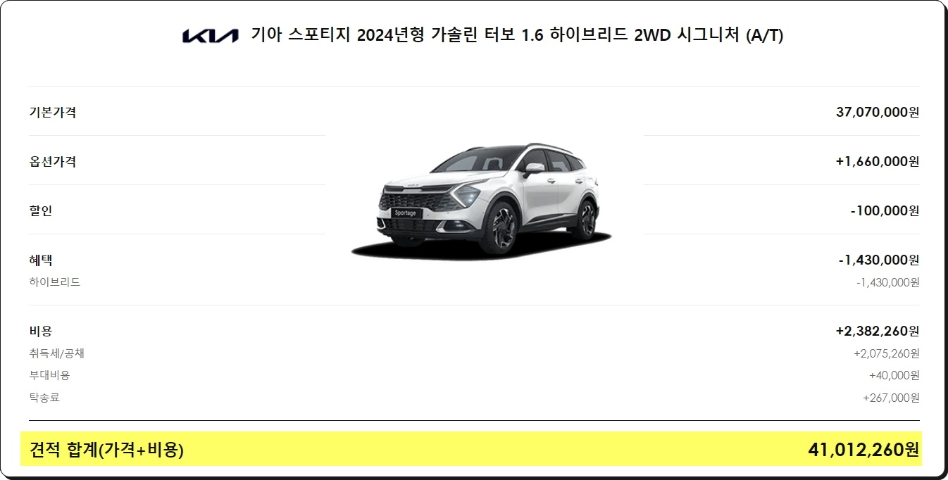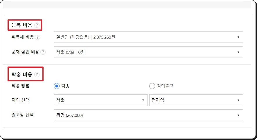 마지막으로 취득세나 공차 할인비용, 탁송료에 관련된 항목을 지정해 주세요. 그럼 다나와 자동차 사이트 오른편에 위치한 표를 통해 자동차 구매 시 발생하는 최종 구입 비용을 확인할 수 있습니다.