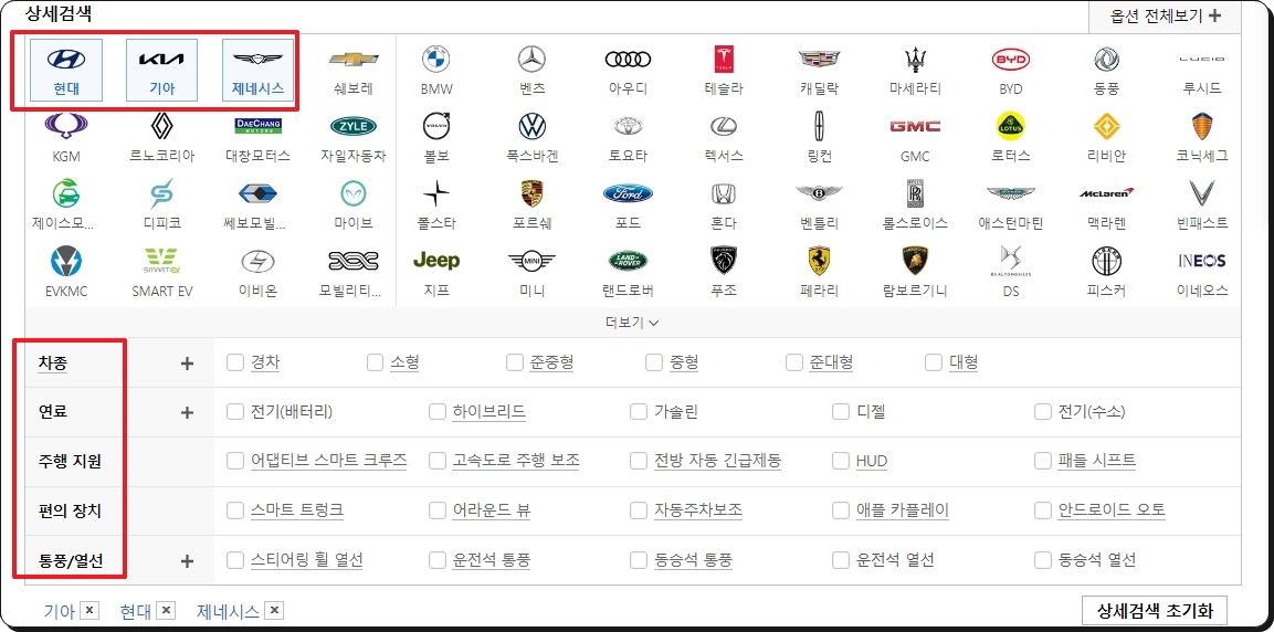 견적을 받아 보기에 앞서 자신이 구매하려고 하는 차량 모델을 알고 있어야 하는데요. 그렇지 않은 경우에는 이렇게 상세 검색 기능을 이용하여 자신에게 맞는 자동차 모델이 무엇인지 쉽게 알아볼 수 있습니다. 몇 가지 조건을 선택해 보세요. 차량 브랜드는 물론이고, 차종이나 연료 타입, 옵션 등 다양한 조건을 지정해 줄 수 있습니다.