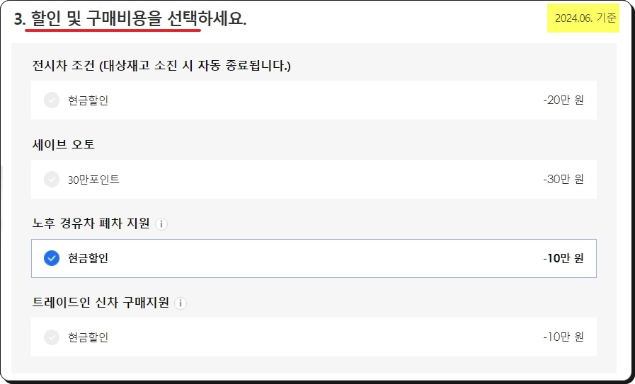 세 번째는 할인 및 구매 비용에 관련된 것인데요. 자동차 회사에서는 매월마다 차량 구매 시 할인을 받을 수 있는 판매 조건을 제시합니다. 이러한 것을 잘 활용한다면 좀 더 싸게 구매할 수 있죠.
