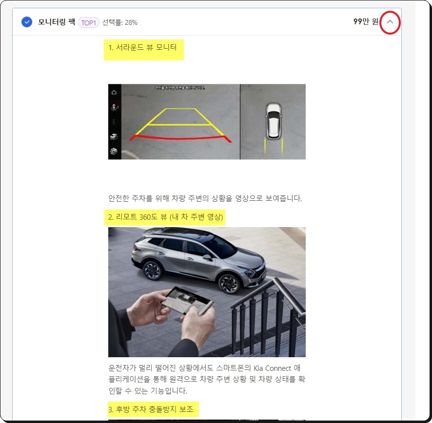 두 번째는 옵션과 색상에 관련된 항목입니다. 여기서도 인기 있는 옵션이 어떤 것인지 바로 확인할 수 있는데요. 옵션의 이름만 보면 어떠한 기능을 제공하는지 파악하기 힘들 수 있어요. 이럴 때는 가격표 옆에 있는 화살표 버튼을 눌러 보세요. 그럼 다나와 자동차 사이트에서 제공하는 설명을 확인할 수 있습니다.