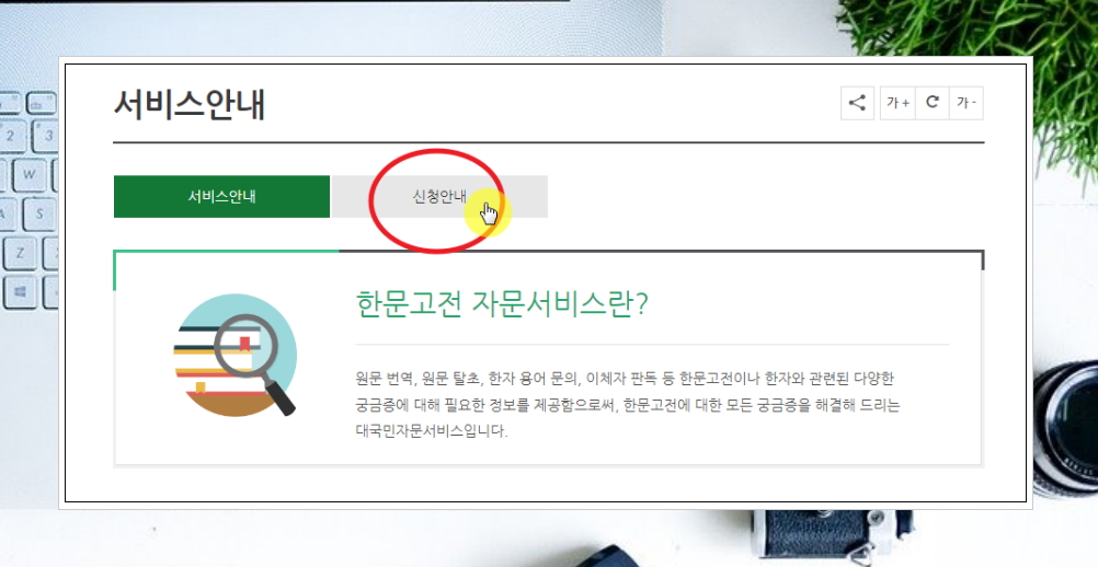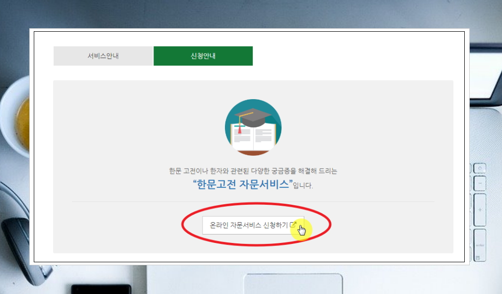 메뉴에서 [신청안내] 버튼을 클릭해 보세요. 그럼 한문고전 자문서비스를 온라인으로 신청할 수 있는 버튼이 나타납니다. 해당 버튼을 누른 후 안내에 따라 내용을 입력하면 자문 신청을 할 수 있습니다.