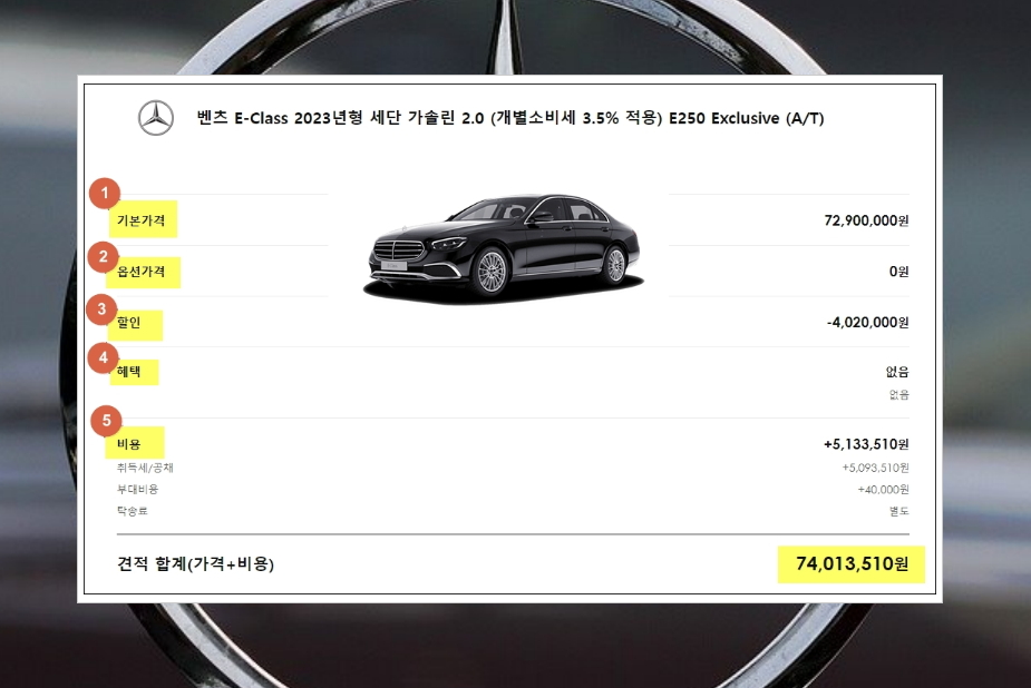 요즘 많은 사람들이 선호하는 벤츠 E-Class 2023년형 E250 Exlusive 모델에 대한 신차 가격표를 뽑아 보았습니다. 402만원의 할인 혜택을 받아 탁송료 제외로 74,013,510원이 나왔는데요. 일반적으로 많은 분들이 대충 보게 되는 기본가격인 72,900,000원과 조금 차이가 있습니다. 실제로 대리점에서 신차 구입을 하는 경우 전자의 금액이 더 맞을 거에요.