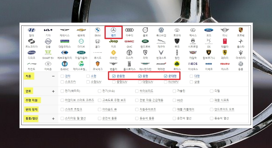 이번에는 벤츠 차량 중에서 자신이 원하는 모델을 선택할 차례인데요. 차종, 연료 타입, 편의 장치, 통풍이나 열선 등의 조건을 선택하면 이를 충족하는 모델을 찾아줍니다.