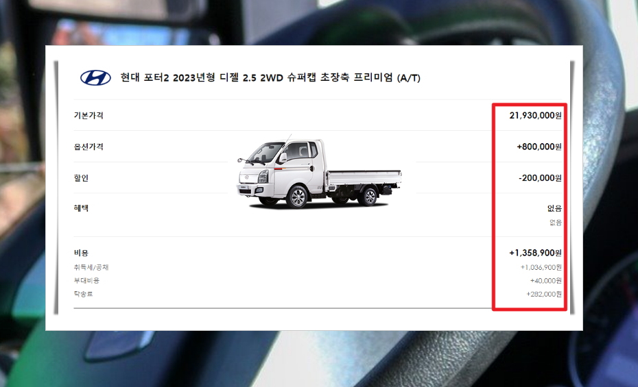 1. 제가 방금 제 취향에 맞게 여러 가지 선택하여 얻은 1톤트럭신차 가격표 입니다. 신차로 구매하는 경우 이렇게 기본금액에 추가로 옵션, 할인, 혜택, 기타 비용이 가감 되는데요. 사람마다 선호하거나 이용할 수 있는 혜택이 다르기 때문에 최종구매비용이 서로 다를 수 밖에 없습니다. 그럼 실제 구매 비용과 거의 같은 최종 가격표를 얻는 방법을 설명 드릴게요.