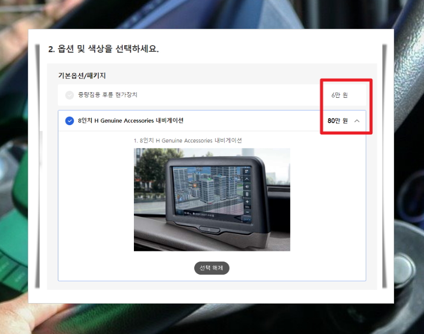 8. 이번에는 옵션을 선택할 차례인데요. 일반적인 자가용에 반하여 1톤트럭에는 옵션 추가를 잘 하지 않는 경향이 있습니다. 이에 따라 중량짐용 후륜 현가장치와 내비게이션 옵션 정도 밖에 선택지가 없네요. 세부모델에 따라 선택할 수 있는 옵션이 달라질 수 있으니 참고하시길 바랍니다.