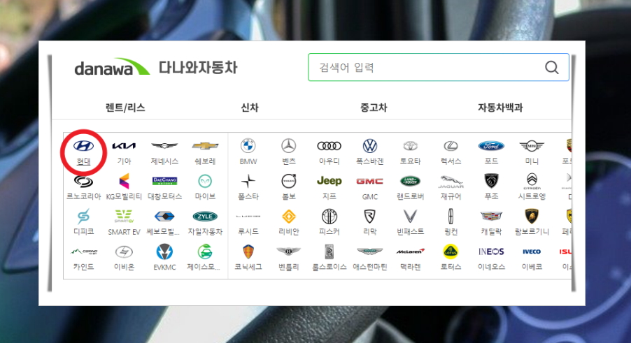 3. 다나와 사이트에 접속하면 메인화면에 여러 가지 브랜드 리스트가 나타납니다. 여기에서 현대자동차를 클릭합니다.