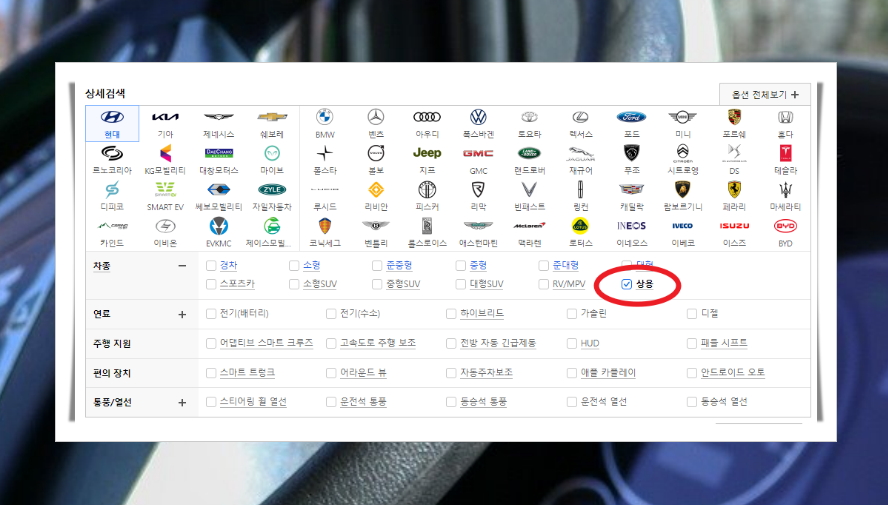 4. 본인이 원하는 현대자동차 1톤트럭신차를 찾기 위해서는 차종, 연료, 주행 지원, 통풍, 열선 등의 조건을 입력하면 되는데요. 일단 "상용"을 선택하면 1톤트럭을 포함한 여러 가지 트럭의 신차 가격표 리스트가 나타납니다.