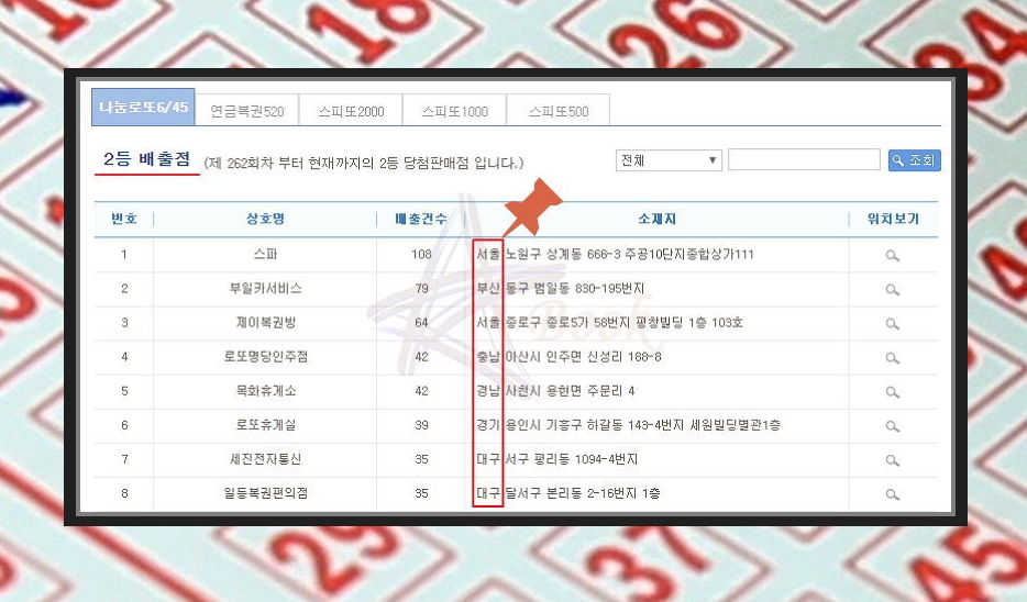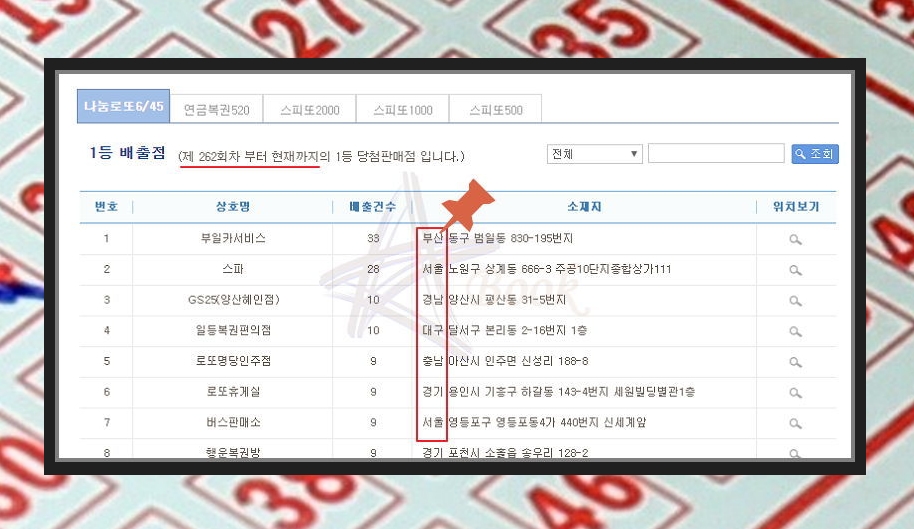 부일카서비스는 로또1등 최대당첨된 곳인데 2등도 많이 배출했네요. 반대로 서울 노원구에 있는 스파는 로또1등을 28건이나 배출한 이력이 있습니다.
