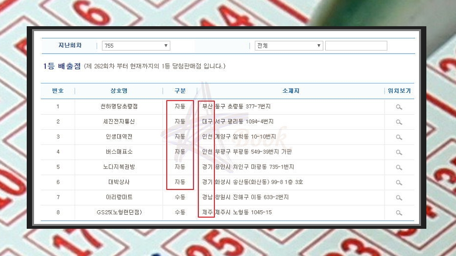 제가 알아본 시점을 기준으로 가장 최근에 진행된 회차는 755회인데요. 로또1등 당첨지역 정보를 보니 인천과 경기가 대세입니다. 8명 중에서 6명이 자동으로 번호를 뽑으신 분들이오니 참고해주세요.