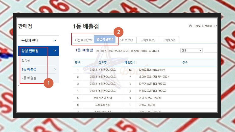 보시는 바와 같이 로또1등 외에도 연금복권 1등 배출점을 알아볼 수 있습니다. 연금복권에 대한 최다당첨된곳은 인터넷 복권판매사이트네요. 당첨지역으로 보면 경기 부천시 춘위동에 있는 춘의사거리 슈퍼이고요.