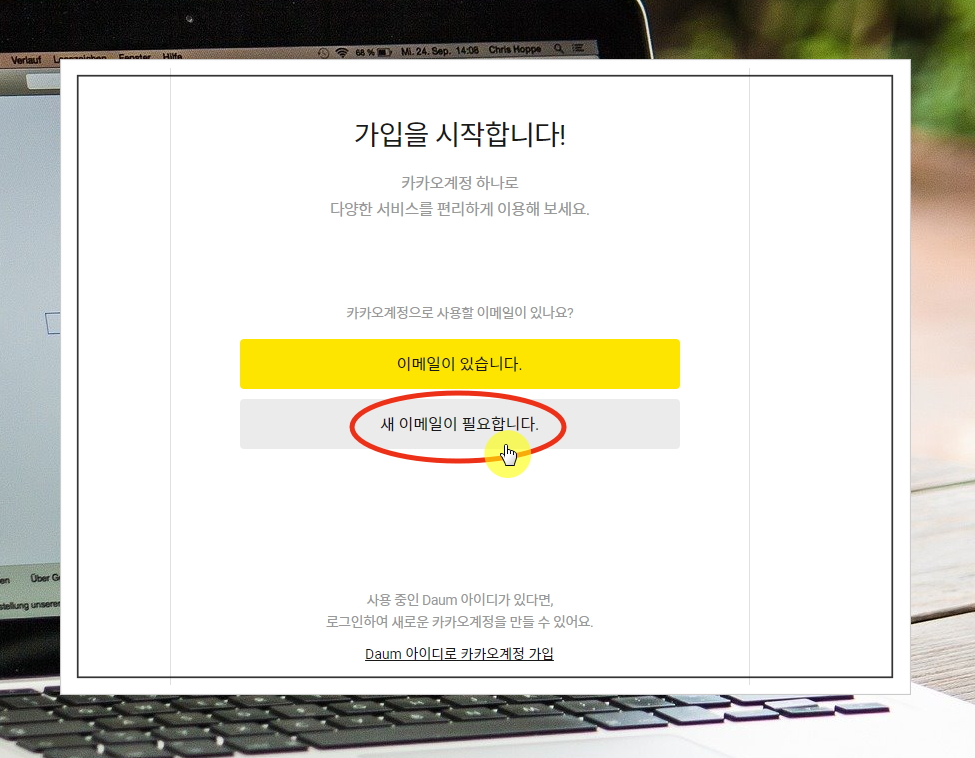 3. 이번 시간에는 카카오 계정이 없다고 가정한 상태에서 새롭게 이메일 주소를 만드는 방법을 알려 드리겠습니다. 화면이 전환되면 새로운 카카오 계정 만들기 버튼을 클릭해 주세요.