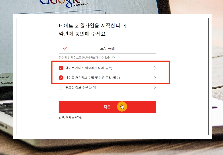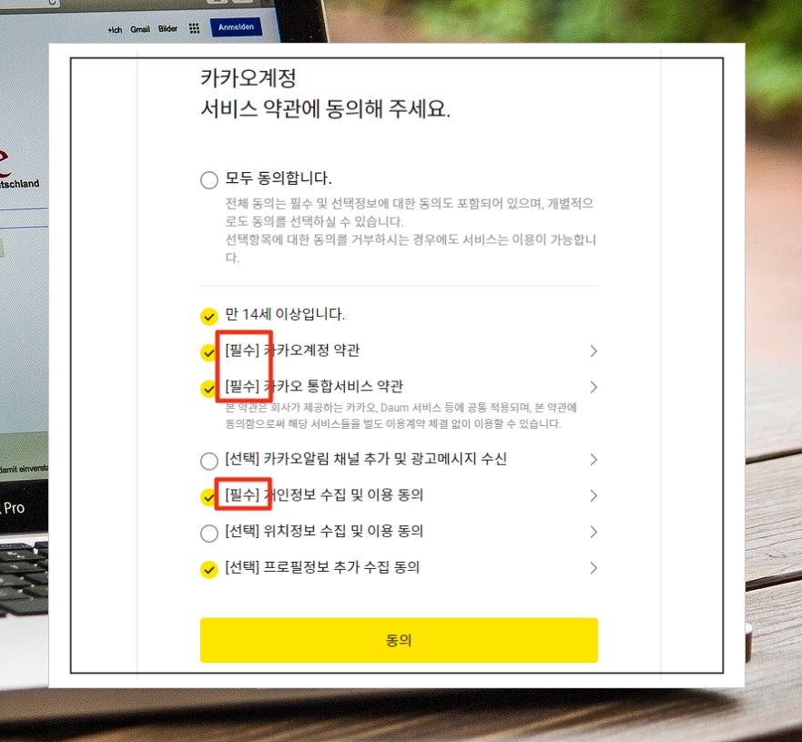 5. 계정을 만들기 위해서는 it 기업의 서비스 약관에 동의를 해야 하는데요. 필수라고 표시되어 있는 부분은 모두 체크를 해야 다음 단계로 넘어갈 수 있습니다. 선택 부분은 자신이 보고 판단 후, 본인에게 필요하다고 생각되면 체크하시면 됩니다.