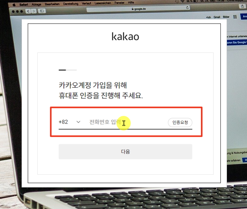6. 카카오 계정 가입을 위해서는 휴대폰인증을 진행해야 하는데요. 사용하고 있는 본인 명의로 된 핸드폰이 있어야 합니다. 전화번호를 입력한 후 인증번호를 받아 해당 사이트에 입력하기만 하면 되는데요. 그 다음부터는 사용하고 싶은 이메일 주소와 비밀번호 그리고 추가적인 개인 정보를 입력하면 됩니다.
