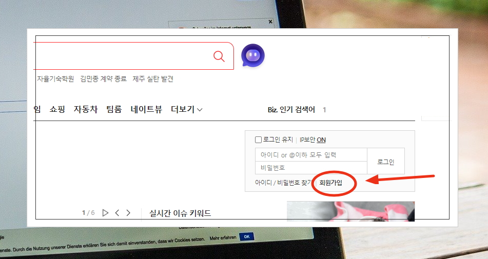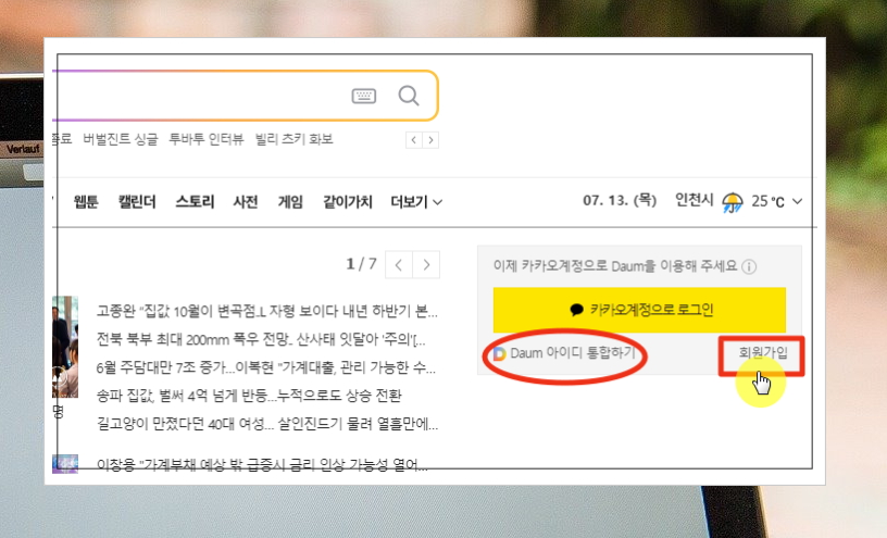 2. 그럼 먼저 다음 계정을 만드는 방법을 알려 드리겠습니다. 다음 사이트에 접속한 후 우측에 있는 회원가입 버튼을 클릭해 주세요. 혹시 카카오톡을 사용하는 경우에는 카카오 계정을 가지고 있을 텐데요. 다음 아이디와 통합이 가능합니다. 그런 경우에는 카카오 계정으로 로그인 버튼을 클릭해 주세요.