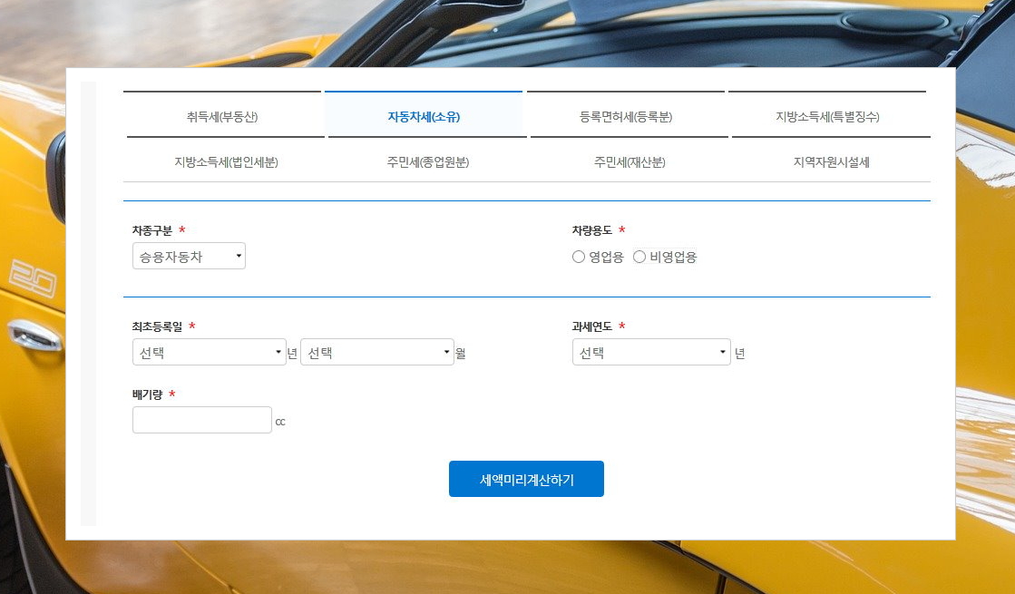 취득세, 등록면서세, 주민세 등 여러 세금에 대한 금액을 알아볼 수 있는데요. 카테고리에서 자동차세(소유)를 클릭해 주세요. 그럼 우리가 찾던 계산기가 나타나요. 항목을 선택하고, 빈 칸을 입력한 후 '세액미리계산하기' 버튼을 눌러주세요.