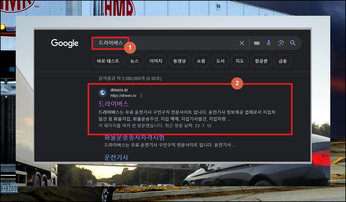 5. 이번에는 화물운송 기출문제를 무료로 푸는 방법을 알려드리도록 하겠습니다. "드라이버스"라는 사이트에서 제공하는 서비스를 이용하면 되는데요. 사이트에 접속해서 어떻게 이용하는지 알려드릴게요.